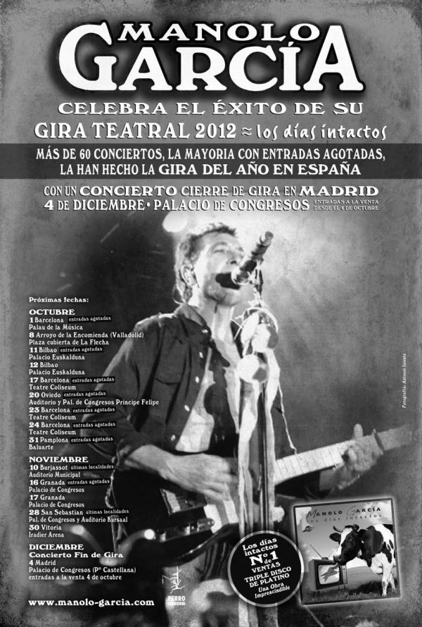 Estos son algunos de los titulares que está recibiendo Manolo García a su paso por ciudades de todo el estado presentando su nuevo trabajo Los días intactos. El disco ha estado tres semanas consecutivas en el número 1 de la lista de los más vendidos en España tras su publicación y es Triple Disco de Platino.