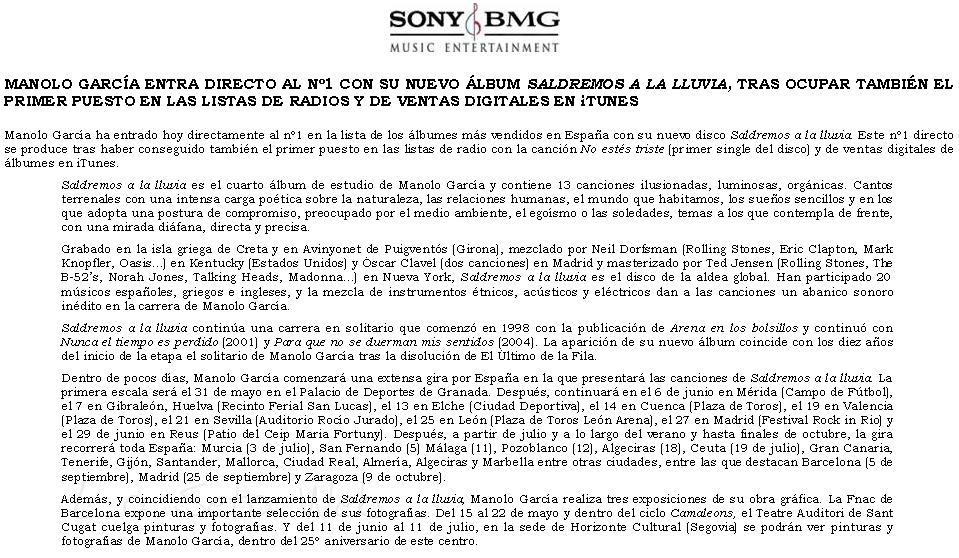 Según nos informa Sony Bmg a través de nota de prensa, Manolo García entró ayer directamente al nº1 en la lista de los álbumes más vendidos en España con su nuevo disco "Saldremos a la lluvia". Este nº1 directo se produce tras haber conseguido también el primer puesto en las listas de radio con la canción No estés triste (primer single del disco) y de ventas digitales de álbumes en iTunes.